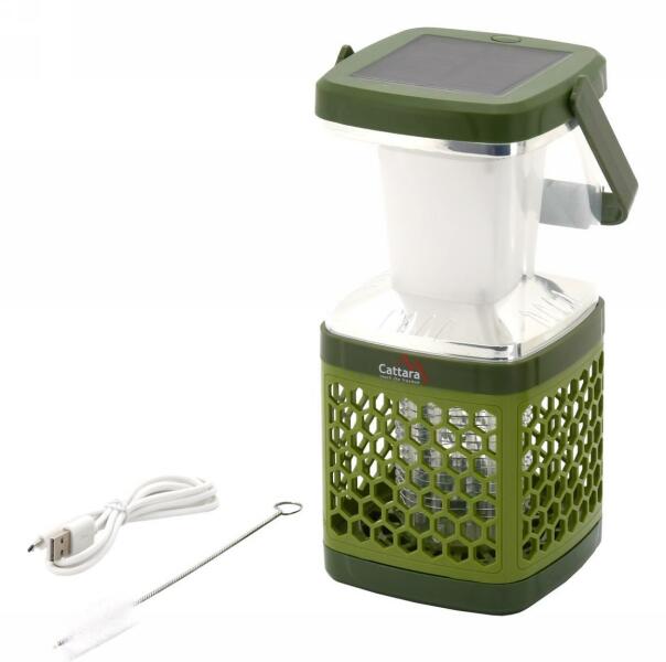 "Elektronikus rovarfogóval ellátott lámpa, amely ultraibolya sugarak segítségével hatékonyan vonzza a repülő rovarokat (pl. legyeket, molyokat, szúnyogokat és másokat). A nagyfeszültségű fémhálóval való érintkezés után a rovarok elektromos áram hatására elpusztulnak. Az irtó nem használ semmilyen vegyszert, szag és környezetszennyezés nélkül működik. A készülék alkalmas otthoni használatra, kertben, kempingben, de éttermekben és étkezdékben, irodákban, kórházakban stb. A készülék asztalra helyezhető, felakasztható, hordozható. Egy további eszköztartozék tartalmaz egy napelemet a folyamatos újratöltéshez közvetlen fényben. Általános világításhoz 60 lm-es fényáramú SMD LED-eket használnak, amelyeket Li-Ion 18650 akkumulátor táplál. A mellékelt mikro-USB-kábel töltésére szolgál. A vezérlés egy gombbal oldható meg, amellyel válthatunk a világítási módok, a csapda és a két funkció kombinációja között. A zseblámpa mérete 100 x 100, magassága 205 mm, súlya pedig 370 g. Műszaki adatok FénySMD LED-ekFényáram60 lmTápellátásLi-Ion 18650 1800 mAhTöltésmikro USB / napelemMéretek100 x 100 x 205 mmSúly370 gTöltési idő5 óraLapolási idő9 óraVilágítási idő13 óraLapozási idő világítással6 óraTerület lefedettsége30 m2"