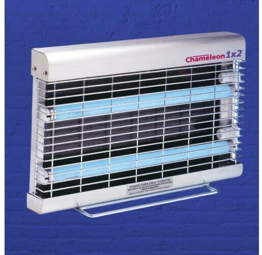 A CHAMELEON sorozat UV fénycsöves ragasztós rovarcsapdáinak alkalmazása lehetővé teszi, hogy a repülő rovarokat irtószer kihelyezése nélkül mindenütt befogják, ahol élelmiszert tartanak. A ragasztós lapok egyúttal a rovarfertőzés mértékéről is hasznos információkat szolgáltatnak. A ragasztólapos módszert alkalmazó CHAMELEON rovarcsapdák diszkrét megjelenésűek és egyserűen karbantarthatók. A ragasztós csapda alkalmazásával a rovarok gyorsan és hatékonyan befoghatók, ezáltal nem áll fenn annak a veszélye hogy a rovarok a csapdából kiessenek vagy más módon kikerüljenek. A CHAMELEON berendezéseket ezért a fokozottan veszélyeztetett területeken is kihelyezhetjük, mert azok a HACCP követelményeknek minden tekintetben megfelelnek. A fénycsövek teflon védőhüvellyel rendelkeznek, aminek a következtében az esetlegesen széttört fénycsövek üvegszilánkjai nem szóródnak szét a környezetben. A berendezések csendesek, higiénikusak és minden méretű repülő rovar befogására alkalmasak, beleértve a kisebb méretű fajokat is, mint pl. a gyümölcslegyek. A CHAMELEON 1x2 tetszetős, ultra vékony, falra szerelhető berendezés. Fehér és rozsdamentes kivitelben is kapható. 2db 15 wattos Quantum BL UV fénycső és egy ragasztós lap 180°-os lefedettséget biztosít.