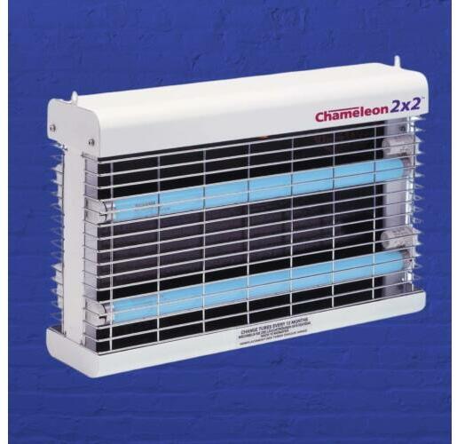 A CHAMELEON sorozat UV fénycsöves ragasztós rovarcsapdáinak alkalmazása lehetővé teszi, hogy a repülő rovarokat irtószer kihelyezése nélkül mindenütt befogják, ahol élelmiszert tartanak. A ragasztós lapok egyúttal a rovarfertőzés mértékéről is hasznos információkat szolgáltatnak. A ragasztólapos módszert alkalmazó CHAMELEON rovarcsapdák diszkrét megjelenésűek és egyserűen karbantarthatók. A ragasztós csapda alkalmazásával a rovarok gyorsan és hatékonyan befoghatók, ezáltal nem áll fenn annak a veszélye hogy a rovarok a csapdából kiessenek vagy más módon kikerüljenek. A CHAMELEON berendezéseket ezért a fokozottan veszélyeztetett területeken is kihelyezhetjük, mert azok a HACCP követelményeknek minden tekintetben megfelelnek. A fénycsövek teflon védőhüvellyel rendelkeznek, aminek a következtében az esetlegesen széttört fénycsövek üvegszilánkjai nem szóródnak szét a környezetben. A berendezések csendesek, higiénikusak és minden méretű repülő rovar befogására alkalmasak, beleértve a kisebb méretű fajokat is, mint pl. a gyümölcslegyek. A CHAMELEON 2x2 mennyezetre függeszthető: alkalmas nagy, nyitott terek védelmére. Elhelyezhető közlekedő folyósokon is. 360°-os vonzáskörzet, két ragasztós lappal és 4 db Quantum BL UV fénycsővel. Fehér és rozsdamentes kivitelben is megvásárolható. Kihelyezés: Mennyezetre szerelt. Lefedettség: 180 m2.