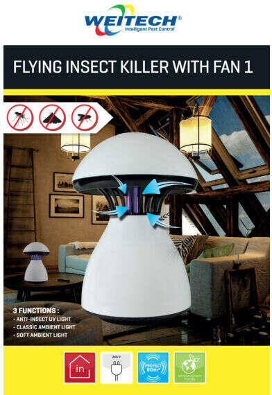 Weitech Rovarirtó Lámpa Ventilátorral: Hatékony védelem a repülő rovarok ellen ? Ez a Weitech rovarirtó lámpa egy innovatív megoldás a bosszantó repülő rovarok elleni küzdelemben. Az ultraibolya fény vonzza a rovarokat, a beépített ventilátor pedig azonnal beszippantja őket a gyűjtőtálcába, ahol kiszáradnak. A készülék használata egyszerű és biztonságos, ideális otthoni használatra. Főbb jellemzők: 3 funkció egyben: rovarirtó UV fény, klasszikus világítás és hangulatfény ? Hatékony rovarfogás: Az UV fény és a ventilátor kombinációja garantálja a gyors és hatékony rovarirtást. Hosszú élettartam: A lámpa élettartama 10 000 óra. ⏱️ Könnyű használat: Csak csatlakoztassa a konnektorba és kapcsolja be. Tökéletes otthoni használatra: Diszkrét design, könnyen integrálható bármely helyiségbe. Méretek: 300 x 200 mm Élvezze a nyugalmat rovarok nélkül!